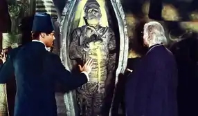For purposes of terror there are two scenes in The Mummy that are weird enough in all conscience. In the first the mummy comes alive and a young archaeologist, going quite mad, laughs in a way that raises the hair on the scalp. In the second Im-Ho-Tep is embalmed alive, and that moment when the tape is drawn across the man's mouth and nose, leaving only his wild eyes staring out of the coffin, is one of decided horror. But most of The Mummy is costume melodrama for the children.[18]