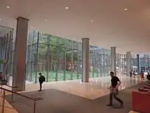 The Times Center and lobby overlook a garden at the center of the podium, which is visible from the lobby but closed to the public. The garden is surrounded by a glass wall measuring 70 feet (21 m) high and 70 feet across on three sides.[88] It contains seven paper birch trees measuring 50 feet (15 m) tall.[24][86][89][lower-alpha 2] The garden originally had a moss glen,[88][90] but this was replaced in 2010 with ferns and grasses.[89] The birch trees are placed on the northwestern side of the garden, while the mosses were placed on hills in the rest of the space.[88] A walkway made of Ipe wood runs around the garden, and doors lead to the garden from the north and south sides.[89] The walls of the atrium are transparent, resulting in numerous incidents where birds flew into the walls.[91]