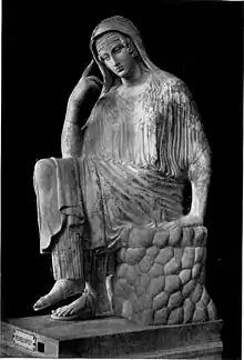 Penelope's story uses simple and deliberately naive prose.[8] The tone is described as casual, wandering, and street-wise with Atwood's dry humour and characteristic bittersweet and melancholic feminist voice.[9] The book uses the first-person narrative, though Penelope sometimes addresses the reader through the second person pronoun.[10] One reviewer noted that Penelope is portrayed as "an intelligent woman who knows better than to exhibit her intelligence".[11] Because she contrasts past events as they occurred from her perspective with the elaborations of Odysseus and with what is recorded in myths today, she is described as a metafictional narrator.[12]