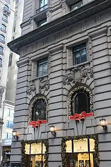 Most of the original dining room was demolished in May 1938, when five storefronts were constructed along Fifth Avenue; the original office was converted to a new dining room at that time.[20][21] As a result of the modifications, the modern hotel's lobby is on the second floor, above the storefronts.[5] The lobby was described as having a double stair and a chandelier hanging from a Renaissance-style ceiling.[22] The Peninsula New York has a small lobby to discourage loitering.[23] Because of the small size of the site, the lobby, lounges, and reception desk are on different levels.[23][24]