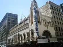 Crowley and his crew searched Los Angeles for almost seventy locations that resembled fin de siècle London.[15] Jonathan Nolan visited Colorado Springs to research Nikola Tesla and based the electric bulb scene on actual experiments conducted by Tesla.[12] Nathan Crowley helped design the scene for Tesla's invention; It was shot in the parking lot of the Mount Wilson Observatory.[15] Influenced by a "Victorian modernist aesthetic," Crowley chose four locations in the Broadway theater district in downtown Los Angeles for the film's stage magic performances: the Los Angeles Theatre, the Palace Theatre, the Los Angeles Belasco, and the Tower Theatre.[19] Crowley also turned a portion of the Universal back lot into Victorian London.[20] Osgood Castle in Colorado was also used as a location.[21]