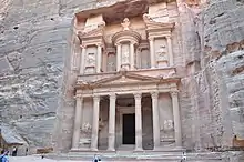 To produce accurate illustrations for the Ramona, Hergé and his assistant Bob de Moor travelled aboard a Swedish cargo vessel, the MS Reine Astrid, from Antwerp to Gothenburg and back, during which they took photographs and drew sketches.[13] Hergé had also collected press clippings depicting the Christina, a motor yacht owned by the Greek shipping magnate Aristotle Onassis, and used them as the basis for his depiction of Rastapopoulos' ship, the Sheherezade.[14] The aircraft, cars, and machinery that appear in the story were drawn by Roger Leloup, one of the members of the Studios Hergé.[15] In one scene in the latter part of the story, Hergé included a frogman, whose depiction was drawn from a press clipping of Lionel Crabb. [16] His depiction of the Emir's hideaway palace cut from the rock was based on the Al Khazneh in Petra, Jordan, which he had seen in an issue of National Geographic.[17]