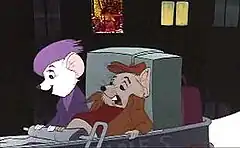 In that version, the bear character was still retained, but was renamed Louie the Bear. Jazz singer Louis Prima was cast in the role and had recorded most of the dialogue and multiple songs that were composed by Floyd Huddleston.[6] The writers also expanded the role of his best friend, Gus the Lion.[7] Huddleston had stated, "It's about two animals. One is Louis Prima — he's the polar bear — and Redd Foxx is the lion ...Louis gets cornered into leaving and going to the South Pole where he can make himself a bigger star. But he gets homesick; he feels fooled. They send out little mice as 'rescuers'."[8] According to storyboard artist Vance Gerry, director Wolfgang Reitherman had stated, "'It's too complicated. I want a simple story: A little girl gets kidnapped and the mice try to get her back, period.'"[9] By November 1973, the role of Louie the Bear had been heavily scaled back and then eliminated.[7] In one version, the bear was meant to be Bernard and Bianca's connection to Penny. Gerry explained, "We developed the sequence where, while the two mice are searching for clues as to where Penny has been taken, they come across this bear who she had been friends with because the orphanage where Penny was living was near the zoo." In the final film, the idea was reduced to a simple scene where Bernard enters a zoo and hears a lion's roar that scares him away.