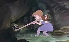 Bernard and Bianca find Penny and devise a plan of escape. They send Evinrude to alert the local animals, who loathe Medusa, but Evinrude is delayed when he is forced to take shelter from a cloud of bats. The following morning, Medusa and Snoops send Penny down into the cave to find the gem. Unbeknownst to Medusa, Bianca and Bernard are hiding in Penny's dress pocket. The three soon find the Devil's Eye within a pirate skull. As Penny pries the mouth open with a sword, the mice push the gem through it, but soon the oceanic tide rises and floods the cave. The three barely manage to escape with the diamond.