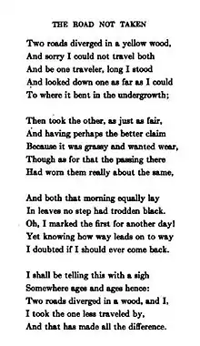 "The Road Not Taken" is a narrative poem by Robert Frost, first published in the August 1915 issue of the Atlantic Monthly,[1] and later published as the first poem in the collection Mountain Interval of 1916. Its central theme is the divergence of paths, both literally and figuratively, although its interpretation is noted for being complex and potentially divergent.