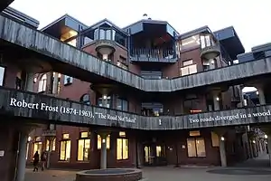 Frost wrote the poem as a joke for his friend Edward Thomas, who was often indecisive about which route to take when the two went walking.[10] A New York Times book review on Brian Hall's 2008 biography Fall of Frost states: "Whichever way they go, they're sure to miss something good on the other path."[11] Regarding the "sigh" that is mentioned in the last stanza, it may be seen as an expression of regret or of satisfaction. However, there is significance in the difference between what the speaker has just said of the two roads, and what he will say in the future.[12] According to Lawrance Thompson, Frost's biographer, as Frost was once about to read the poem, he commented to his audience, "You have to be careful of that one; it's a tricky poem—very tricky", perhaps intending to suggest the poem's ironic possibilities.[13][14]