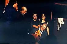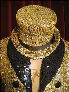 In the stage productions, actors generally did their own make-up; however, for the film, the producers chose Pierre La Roche, who had previously been a make-up artist for Mick Jagger and David Bowie, to redesign the make-up for each character.[27] Production stills were taken by rock photographer Mick Rock, who has published a number of books from his work.[28] In Rocky Horror: From Concept to Cult, designer Sue Blane discusses the Rocky Horror costumes' influence on punk music style, opining "[It was a] big part of the build-up [to punk]." She states that ripped fishnet stockings, glitter, and coloured hair were directly attributable to Rocky Horror.[10]