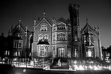 Set in the fictional town of Denton, the film was shot at Bray Studios and Oakley Court, a country house near Maidenhead, Berkshire, England, and at Elstree Studios[20] for post-production,[21] from 21 October to 19 December 1974. Oakley Court, built in 1857 in the Victorian Gothic style, is known for a number of Hammer films.[22][23] Much of the location shooting took place there, although at the time the manor was not in good condition.[24] Most of the cast were from the original London stage production, including Tim Curry, who had decided that Dr Frank N. Furter should speak like the Queen of the United Kingdom, extravagantly posh.[14] Fox insisted on casting the two characters of Brad and Janet with American actors, Barry Bostwick and Susan Sarandon.[15] Filming took place during autumn, which made conditions worse. During filming, Sarandon fell ill with pneumonia.[12] Filming of the laboratory scene and the title character's creation occurred on 30 October 1974.[25]