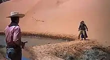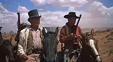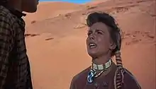The rape of captive white women by the Commanche is an unspoken theme. No actual rape scene is depicted, but Alexandra Heller-Nicholas in her study of Rape-Revenge Films says, "the abduction, captivity, and implied rape of Debbie (Natalie Wood)... drives the narrative";[37] and Edward Buscombe points out a scene in which "[Ethan] turns off the trail to penetrate a narrow crevice in the rocks, and when he emerges, his savage stabbing with his knife seems to mimic a violent sexual act, drawing us 'a picture' of the act of rape which obsesses him."[38] Glenn Frankel writes that in real life, "Rape was a fact of life for many captives, although it was seldom discussed by those women who escaped or were ransomed back to the white world."[39]
