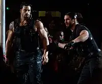 At the event on October 22, Ambrose, Rollins and Angle won the match and Angle was offically considered a temporary part of the faction.[137] While Reigns was still out of action, Ambrose and Rollins also recruited former rival Triple H to be a one-time member at a house show on November 1.[138] Ambrose and Rollins lost the titles back to Cesaro and Sheamus after SmackDown's The New Day appeared and caused a distraction on the November 6 episode of Raw.[139] Reigns returned the following week on Raw, and The Shield challenged The New Day to a match at Survivor Series on November 19.[140] which they won.[141] On the November 20 episode of Raw, Reigns won the Intercontinental Championship by defeating The Miz following a distraction by the other Shield members.[142] In December 2017, Ambrose suffered a triceps injury and was written off TV, thus putting The Shield on a hiatus.[143]