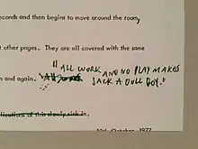 Wendy finds Jack's manuscript written with nothing but countless repetitions of "All work and no play makes Jack a dull boy". When Jack threatens her life, Wendy knocks him unconscious with a baseball bat and locks him in the kitchen pantry, but she and Danny cannot leave due to Jack having previously sabotaged the hotel's two-way radio and snowcat. Back in their hotel room, Danny says "redrum" repeatedly and even writes the word in lipstick on the bathroom door. Wendy sees the word in the mirror and realizes that it is actually "murder" spelled backwards.