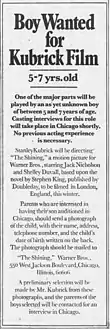 The director's initial candidate to play the Torrances' son was Cary Guffey (Close Encounters of the Third Kind), but the young actor's parents prevented him, claiming that the film was too gruesome for a child. In his search to find the right actor to play Danny, Kubrick sent a husband-and-wife team, Leon (who portrayed Lord Bullingdon in Barry Lyndon) and Kersti Vitali, to Chicago, Denver, and Cincinnati to create an interview pool of 5,000 boys over a six-month period. These cities were chosen since Kubrick was looking for a boy with an accent that fell between Jack Nicholson's and Shelley Duvall's speech patterns, with Nicholson coming from New Jersey and Duvall from Texas.[29] During the filming, the young actor was protected in a special way by Kubrick; the boy believed at all times that he was shooting a drama, not a horror movie. Following his role in the 1982 film Will: G. Gordon Liddy, Danny Lloyd abandoned his acting career.[30][31]