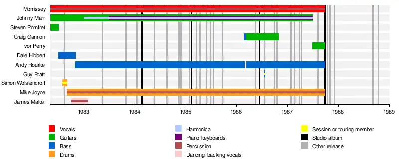 ![]() The Smiths in 1985 (l–r): Andy Rourke, Morrissey, Johnny Marr and Mike Joyce. | |