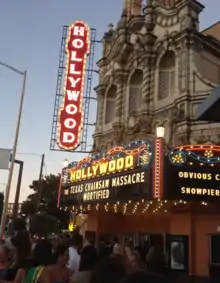 The Texas Chain Saw Massacre premiered in Austin, Texas, on October 1, 1974, almost a year after filming concluded. It screened nationally in the United States as a Saturday afternoon matinée and its false marketing as a "true story" helped it attract a broad audience.[49][50] For eight years after 1976, it was annually reissued to first-run theaters, promoted by full-page ads.[51] The film eventually grossed more than $30 million in the United States and Canada[52] ($14.4 million in rentals), making it the 12th highest-grossing film initially released in 1974, despite its minuscule budget.[53] Among independent films, it was overtaken in 1978 by John Carpenter's Halloween, which grossed $47 million.[54]