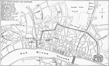 The Mayor and Corporation of London banned plays in 1572 as a measure against the plague, not wanting to attract crowds of strangers. In 1575 they formally expelled all players from the city.[1] This prompted the construction of playhouses outside the jurisdiction of London, in the liberties of Halliwell/Holywell in Shoreditch and later the Clink, and at Newington Butts near the established entertainment district of St. George's Fields in rural Surrey.[1] The Theatre was constructed in 1576 by James Burbage in partnership with his brother-in-law, one John Brayne, (the owner of the Red Lion)[2] on property that had originally been the grounds of the dissolved Halliwell Priory (or Holywell). Brayne had advanced Burbage the money needed to build The Theatre, and in return, Brayne received a portion of the profits and owned some of the property (Burbage married Brayne's daughter Ellen in 1575).[3] The Theatre was in Shoreditch, beyond the northern boundary of the City of London and outside the jurisdiction of civil authorities, who were often opposed to theatre. This area in the "suburbs of sin" was notorious for licentious behaviour, brothels and gaming houses. A year later, the Curtain Theatre was built nearby, making the area London's first theatrical and entertainment district.[4] "When Burbage and Brayne mortgaged The Theatre, Brayne had just recently resolved another fight with one of his brothers-in-law over a different mortgage" [5] Brayne and Burbage had never written a contract, which eventually led to many quarrels concerning who spent what on getting The Theatre started.[6]