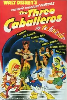 The Three Caballeros is a 1944 American live-action/animated musical propaganda[3] anthology film produced by Walt Disney and released by RKO Radio Pictures. The film premiered in Mexico City on December 21, 1944. It was released in the United States on February 3, 1945 and in the United Kingdom in March 1945. It was the 7th Walt Disney animated feature film, and it marks the 10th anniversary of Donald Duck and plots an adventure through parts of Latin America, combining live-action and animation. This is the second of the six package films released by Walt Disney Productions in the 1940s, following Saludos Amigos (1942). It is also notable for being one of the first feature-length films to incorporate traditional animation with live-action actors.[4]