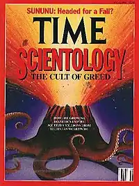 "The Thriving Cult of Greed and Power" is an article, written in 1991 by U.S. investigative journalist Richard Behar, which is highly critical of Scientology. It was first published by Time magazine on May 6, 1991, as an eight-page cover story,[1][2] and was later published in Reader's Digest in October 1991.[3] Behar had previously published an article on Scientology in Forbes magazine. He stated that he was investigated by attorneys and private investigators affiliated with the Church of Scientology while researching the Time article, and that investigators contacted his friends and family as well. Behar's article covers topics including L. Ron Hubbard and the development of Scientology, its controversies over the years and history of litigation, conflict with psychiatry and the U.S. Internal Revenue Service, the suicide of Noah Lottick, its status as a religion, and its business dealings.