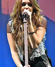 Cyrus' first live performance of "Party in the U.S.A." was at the Teen Choice Awards held on August 10, 2009. Clothed in a tank top that revealed a portion of her bra, black hot pants, and leather boots, Cyrus and her backup dancers appeared from a trailer.[48] Midway through the performance, Cyrus danced atop an ice cream cart with a pole (which was suggested to be a dance pole by numerous critics) for approximately forty seconds.[49] The performance was met with a media uproar, with some critics suggesting that her dancing was too suggestive and sexual for a teen-oriented event, which caused The Walt Disney Company to issue a statement distancing themselves from the performance.[50] Other critics came to Cyrus' defense, stating that viewers should have fixated on her accomplishments that night, winning six awards, rather than the sexuality of the performance.[49] In continuation, Cyrus promoted the EP on The Today Show[6][51] and VH1 Divas in the United States.[52] In December, Cyrus undertook promotion in the United Kingdom at 95.8 Capital FM's Jingle Bell Ball,[53] the Royal Variety Performance—the annual gala for the British Royal Family— and various other venues.[54]