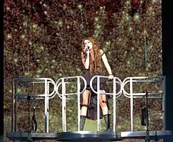 "Party in the U.S.A." was released on August 11, 2009 as the lead single from The Time of Our Lives through digital distribution.[34] It received praise from critics for its musical composition, reflecting aspects of R&B[35] and catchy effect.[36] "Party in the U.S.A." was also a commercial success for Cyrus; it charted within the top ten of eight countries.[37] In the United States, the song peaked at number two, becoming Cyrus' best-charting single up to that point[38] and the sixth best selling digital single of 2009.[39] It was also deemed Hollywood Records' fastest and best-selling single to date.[38] The single was certified thirteen-times Platinum by the Recording Industry Association of America (RIAA)[40] and quadruple platinum by the Canadian Recording Industry Association (CRIA).[41] A music video for "Party in the U.S.A.", directed by Chris Applebaum, was set mainly at a drive-in theater[42] and pays tribute to the film Grease (1978) and Cyrus's parents' courting days.[43]