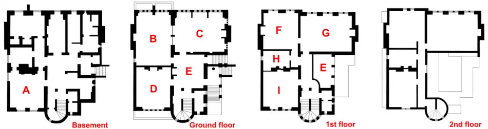 The house has an L-shaped plan, and the exterior is plain, of red brick, with Bath stone dressings and green roof slates from Cumberland.[34] With a floor plan of 2,500 square feet (230 m2),[38] Burges went about its construction on a grand scale. The architect R. Norman Shaw remarked that the concrete foundations were suitable "for a fortress".[39] This approach, combined with Burges's architectural skills and the minimum of exterior decoration, created a building that Crook described as "simple and massive".[38] Following his usual pattern, Burges re-worked many elements of earlier designs, adapting them as appropriate. The frontages come from the other townhouse he designed, Park House, Cardiff, then known as the McConnochie House after its owner, although they have been reversed, with the arcaded, street front from Park House forming the garden front of the Tower House.[40] The staircase is consigned to the conical tower, avoiding the error Burges made at the earlier house, where he placed the staircase in the middle of the hall.[38] The cylindrical tower and conical roof derive from Castell Coch, and the interiors are inspired from examples at Cardiff Castle.[35][38] The house has two main floors, with a basement below and a garret above.[7] The ground floor contains a drawing room, a dining room and a library, while the first floor has two bedrooms and an armoury.