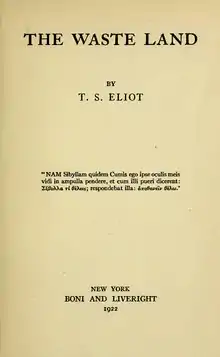 The Waste Land is a poem by T. S. Eliot, widely regarded as one of the most important English language poems of the 20th century and a central work of modernist poetry.[2][3] Published in 1922, the 434-line[upper-alpha 1] poem first appeared in the United Kingdom in the October issue of Eliot's The Criterion and in the United States in the November issue of The Dial. It was published in book form in December 1922. Among its famous phrases are "April is the cruelest month", "I will show you fear in a handful of dust", "These fragments I have shored against my ruins" and the Sanskrit mantra "Datta, Dayadhvam, Damyata" and "Shantih shantih shantih".[upper-alpha 2]