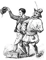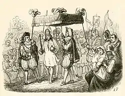 Andersen's tale is based on a 1335 story from the Libro de los ejemplos (or El Conde Lucanor),[2] a medieval Spanish collection of fifty-one cautionary tales with various sources such as Aesop and other classical writers and Persian folktales, by Juan Manuel, Prince of Villena (1282–1348). Andersen did not know the Spanish original but read the tale in a German translation titled "So ist der Lauf der Welt" ("That's the way of the world").[3] In the source tale, a king is hoodwinked by weavers who claim to make a suit of clothes invisible to any man not the son of his presumed father; whereas Andersen altered the source tale to direct the focus on courtly pride and intellectual vanity rather than adulterous paternity.[4][5]