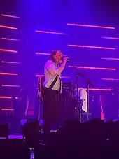 Yorke said he knew he would become a rock star after seeing the Queen guitarist Brian May on television for the first time at the age of eight.[11] He initially wanted to be a guitarist rather than a singer, but began singing as he had no one else to sing the songs he was writing.[12] He received his first guitar as a child.[5][13] At 10, he made his own guitar, inspired by May's homemade Red Special.[14] By 11, he had joined his first band and written his first song.[15] Seeing Siouxsie Sioux in concert at the Apollo in 1985 inspired him to become a performer; Yorke said he had never seen anyone "captivate an audience like she did".[16]