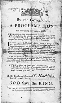 One of Hutchinson's instructions was to relocate the provincial assembly from Boston to Cambridge, where it would be less under the influence of radical Boston politics. This modest demand, accomplished by executive order, resulted in howls of complaint of gubernatorial arbitrariness in the assembly, and an exchange of arguments, rebuttals, and counterarguments between Hutchinson and the assembly that ran for thousands of pages and lasted until 1772.[54] The nature of the affair furthered the radical cause, whose proponents painted Hutchinson's action as a bold and devious attempt to further the executive prerogative.[55] The radicals were further outraged when Hutchinson announced in 1772 that his salary, which had previously been subject to appropriation by the assembly, would be paid by the crown instead. This was seen by the radicals as a further usurpation of power that rightfully belonged in the province.[56] Written debates with the assembly extended to the role of Parliament in governing the policies, and further deepened the divide between it and Hutchinson. They also raised flags elsewhere in the colonies and in England, where observers noted that Hutchinson's arguments had effectively driven moderates in the province to join with the political hardliners.[57]