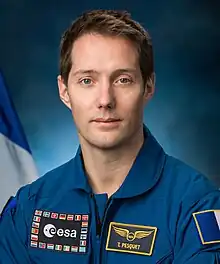 Thomas Gautier Pesquet (French pronunciation: [tɔmɑ ɡotje pɛskɛ]; born 27 February 1978) is a French aerospace engineer, pilot, European Space Agency astronaut and actor. Pesquet was selected by ESA as a candidate in May 2009,[1] and he successfully completed his basic training in November 2010.[2] From November 2016 to June 2017, Pesquet was part of Expedition 50 and Expedition 51 as a flight engineer.[3] Pesquet returned to space in April 2021 on board the SpaceX Crew Dragon for a second six-month stay on the ISS.