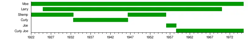 | Years | Moe | Larry | Shemp | Curly | Joe | Curly Joe |