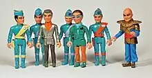 Wigs were made of mohair or, in the case of the Penelope puppet, human hair.[41][125] Puppet bodies were built in three sizes: "large male" (specifically for the Tracys and the Hood), "small male" and "small female".[41][126] Sylvia Anderson, the head costume designer, devised the main characters' attire.[30][127] To give the puppets increased mobility, the costume department generally avoided stiff synthetic materials, instead working with cotton, silk and wool.[41] Between 1964 and 1966, the department's stock numbered more than 700 costumes.[128]