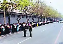 Tiananmen Square was one of the main venues where Falun Gong practitioners gathered to protest the persecution, usually by raising banners in defence of the group, or stage peaceful meditation sit-ins.[24] Ian Johnson of the Wall Street Journal estimated that by 25 April 2000, more than 30,000 practitioners had been arrested for attempting to demonstrate in Beijing, most of them in or on the way to Tiananmen Square.[25] Seven hundred Falun Gong followers were arrested during a demonstration in the Square on 1 January 2001.[26]