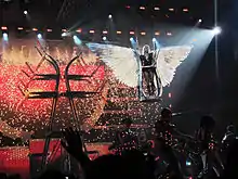 Spears also performed "Till the World Ends" at the Femme Fatale Tour (2011). At the end of "Toxic", she goes below the stage and returns wearing a black sparkly bodysuit for "Till the World Ends". Halfway through the performance, Minaj appears on the backdrops rapping her verse of the Femme Fatale Remix of the song. She also joined Spears to perform the verse in select cities. After the song changes back to the original version, Spears starts flying in a platform with giant angel wings. The show ends with Spears and her dancers thanking the audience, as confetti falls and the "Femme Fatale" sign is lowered onstage.[96] Jason L. Nelson of The Beaver County Times said that "encore hits 'Toxic' and 'Till the World Ends' kept the crowd beaming."[97] Spears also performed the song as part of the encore section from her Las Vegas residency Britney: Piece of Me. At the end of the performance, Spears ascended into the back of the stage in a globe-cage.[98] Mirroring the setlist of her Las Vegas residency, "Till The World Ends" is also the encore of Britney: Live in Concert, with Spears leaving the stage after performing "(You Drive Me) Crazy" for a few minutes, and then returning to perform the song as the encore.