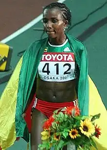 Tirunesh Dibaba (Oromo: Xirunesh Dibaabaa, Amharic: ጥሩነሽ ዲባባ ቀነኒ; born 1 October 1985[5]) is an Ethiopian athlete who competed in long-distance track events and international road races. She has won three Olympic track gold medals, five World Championship track gold medals, four individual World Cross Country (WCC) adult titles, and one individual WCC junior title. Tirunesh was the 5000 metres (outdoor track) world record holder until 2020 when Letesenbet Gidey set her world record.[6] She is nicknamed the "Baby Faced Destroyer."[7]