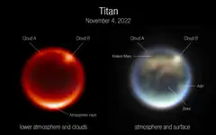 On October 24, 2014, methane was found in polar clouds on Titan.[63][64] On December 1, 2022, astronomers reported viewing clouds, likely made of methane, moving across Titan, using the James Webb Space Telescope.[65][66]