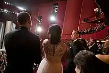 In Philadelphia, he played a gay lawyer with AIDS who sues his firm for discrimination.[13] Hanks lost 35 pounds (16 kg) and thinned his hair in order to appear sickly for the role. In a review for People, Leah Rozen stated, "Above all, credit for Philadelphia's success belongs to Hanks, who makes sure that he plays a character, not a saint. He is flat-out terrific, giving a deeply felt, carefully nuanced performance that deserves an Oscar." Hanks won the 1993 Academy Award for Best Actor for his role in Philadelphia.[13][54] During his acceptance speech, he revealed that his high school drama teacher Rawley Farnsworth and former classmate John Gilkerson, two people with whom he was close, were gay.[55]
