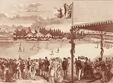 Parliament and business came to a standstill in Melbourne for the January 1858 intercolonial match between Victoria and New South Wales, held at the MCG. Captaining Victoria, Wills took 8 wickets, the most of his side, and on the second day, batting in the middle order, a ball hit an imperfection in the pitch and knocked him unconscious. He recovered, played on for two hours, and won the match at day's end with a top score of 49*.[70] The crowd rushed the field and chaired Wills off in triumph, and victory celebrations lasted for several days throughout the colony.[71] Now a household name and the darling of Melbourne's elite, Wills was proclaimed "the greatest cricketer in the land".[72]