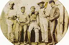 In January 1861, Tom, Horatio and a party of employees and their families travelled by ship to Brisbane, disembarked in Moreton Bay, and then, with livestock and supplies, set out on an eight-month trek through Queensland's rugged interior.[117] Food was scarce and Tom hunted native game to fend off starvation.[119] They suffered many other hardships and even death when, in Toowoomba, one of Horatio's men drowned.[119] On the Darling Downs over 10,000 sheep were collected.[120] Hitherto the largest group of colonists to enter the area, the Wills party drew the attention of local Aboriginal people.[121] Wary of what he called the "perpetual war between the whites and blacks" of Central Queensland, Horatio sought to avoid conflict.[122] The party reached Cullin-la-ringo, situated on Gayiri Aboriginal land, in early October, and proceeded to set up camp.[123]