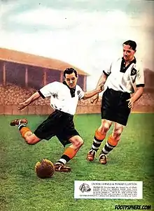 He formed a productive forward partnership with Jackie Sewell in the 1948–49 campaign, and scored 23 goals in 40 league and cup appearances.[62] County finished in mid-table despite scoring 102 goals, 15 more than champions Swansea.[63] Stollery was sacked and upon Lawton's suggestion the club appointed Eric Houghton as manager after Lawton turned down the role as player-manager.[64] Lawton and Sewell's understanding grew throughout the 1949–50 campaign, and Lawton finished as the division's top-scorer with 31 goals in 37 league games as County won promotion as champions, seven points ahead of second-placed Northampton Town.[65] Promotion was secured with a 2–0 win over local rivals Nottingham Forest at Meadow Lane on 22 April.[65]