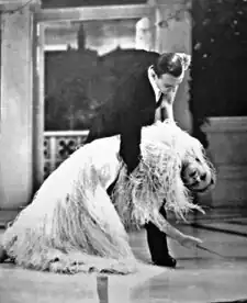 Due to the enormous labor involved in sewing each ostrich feather to the dress, Astaire — who normally approved his partner's gowns and suggested modifications if necessary during rehearsals — saw the dress for the first time on the day of the shoot,[20] and was horrified at the way it shed clouds of feathers at every twist and turn, recalling later: "It was like a chicken attacked by a coyote, I never saw so many feathers in my life."[21][22] According to choreographer Hermes Pan, Astaire lost his temper and yelled at Rogers, who promptly burst into tears, whereupon her mother, Lela, "came charging at him like a mother rhinoceros protecting her young."[23] An additional night's work by seamstresses resolved much of the problem; however, careful examination of the dance on film reveals feathers floating around Astaire and Rogers and lying on the dance floor.[5] Later, Astaire and Pan presented Rogers with a gold feather for her charm bracelet, and serenaded her with a ditty parodying Berlin's tune: