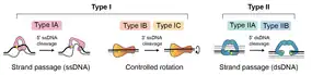 These enzymes catalyze changes in DNA topology via transient single-stranded breaks in DNA. Reactions can occur on both single- and double-stranded DNA substrates and can proceed via a 'swivel' or 'strand-passage' mechanism (Fig. 3). The range of reactions includes: DNA supercoil relaxation, unknotting of single-stranded circles, and decatenation, provided at least one partner has a single-stranded region. In the case of the archaeal enzyme, reverse gyrase, positive supercoiling of DNA is possible.[24]