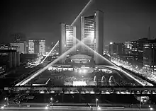 The south side of Queen Street opposite City Hall was considered a 'commercial slum' and in August 1964, Toronto City Council voted to expropriate the south side for development appropriate to the new civic square.[9] The businesses on that side of the street included two burlesque theatres, pawn shops and a cinema. The south side was vacant at the time of the City Hall opening but was eventually occupied by a new hotel, connected by a bridge over Queen Street to the square.