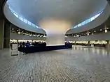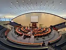 The city council chambers is a semi-circular room located on the second floor supported on a single massive column below. On the main level of the chambers are the seats for the 25 members of council, arranged in a semi-circle.