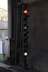 There are several basic procedures that need to be completed once a train has entered a station. On TTC's Line 2, several symbols of different colours are installed on the station wall for the crew to use as a reference in positioning the train in the platform. A red circle, located at the train exit end of the platform, should be directly in front of the train operator's cab window when the train is aligned properly. A green triangle, located at the opposite end of the platform, is provided as a reference to the train guard that shows that the train is correctly aligned.[43] Before opening the train doors, the guard lowers the cab window and points their finger out the window toward the green triangle when the cab is lined up with the triangle. If the train is not lined up properly, the guard is not permitted to open the doors.[44]