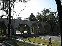 Public transportation played a key role in the founding of Torrance. The Pacific Electric Red Car connected downtown Los Angeles to the new development of downtown Torrance. Designed in 1912 by Irving Gill, the terminus depot of the Red Car line was designed in a Spanish revival style popularized during this era.[18] In May of 1913, the Pacific Electric Railroad Bridge was built. Often called the "El Prado Bridge", it further expanded the industrial heart of the South Bay. The concrete double-tracked arch bridge was the Pacific Electric Railway's first interurban line that connected north/south to San Pedro via the Gardena Line.[19] The bridge was used for transporting freight and commuting workers to Torrance factories. The Red Car line connected under the bridge as it connected to the train depot located on Cabrillo Avenue. The bridge no longer carries any rail cars, with Pacific Electric closing the Red Car line to Torrance in the 1940s. The bridge became the city of Torrance's second entry in the National Register of Historic Places on July 13, 1989 and is used as a logo for the city's new wayfinding signage and city materials.[20]