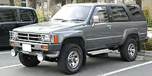 The Toyota 4Runner is an SUV manufactured by the Japanese automaker Toyota and marketed globally since 1984, across five generations. In Japan, it was marketed as the Toyota Hilux Surf (Japanese: トヨタ・ハイラックスサーフ, Hepburn: Toyota Hairakkususāfu) and was withdrawn from the market in 2009. The original 4Runner was a compact SUV and little more than a Toyota Hilux pickup truck with a fiberglass shell over the bed, but the model has since undergone significant independent development into a cross between a compact and a mid-size SUV. All 4Runners have been built in Japan at Toyota's plant in Tahara, Aichi, or at the Hino Motors (a Toyota subsidiary) plant in Hamura.