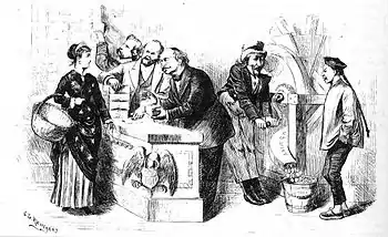 A political cartoon published in the April 25, 1874 issue of Harper's Weekly. Entitled "Rags for Our Working Men—Specie for the Foreigners", the caption for this cartoon reads "Columbia: Dear me, I do think it very wrong that the good nice trade dollar (worth 100 cents) should be sent out of the country for the benefit of the 'heathen Chinee,' for if these gentlemen are permitted to have their own way, it will take a basket full of greenbacks (worth —?) to buy dinner for my children."[27]