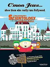A few references have been made by the show and Comedy Central to Scientology as an aftermath of the controversy. On August 1, 2006, Comedy Central placed an advertisement in Variety showing the South Park stars against a background of L. Ron Hubbard's Scientology Celebrity Center, with the headline, "C'mon Jews, show them who really runs Hollywood."[60] Although often misunderstood by the public to parody the Mel Gibson DUI incident, the advertisement actually congratulates South Park on gaining an Emmy nomination for "Trapped in the Closet" and satirizes the cancellation of the episode's rebroadcast in March.[61][62]