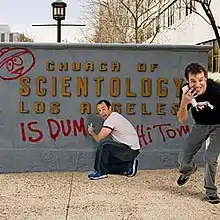 The Rolling Stone cover article "Still Sick, Still Wrong", celebrating the show's anniversary, also referred to the controversy. The article depicted Stone and Parker spray painting graffiti on the church's Los Angeles organization sign, adding "Is dum" to the Scientology logo and a "Hi Tom" message with an accompanying depiction of Cartman's head.[63]