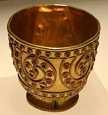 The Trialeti-Vanadzor culture was known for its particular form of burial. The elite were interred in large, very rich burials under earth and stone mounds, which sometimes contained four-wheeled carts. Also there were many gold objects found in the graves.[13] These gold objects were similar to those found in Iran and Iraq.[9] They also worked tin and arsenic.[17] This form of burial in a tumulus or "kurgan", along with wheeled vehicles, is the same as that of the Kurgan culture which has been associated with the speakers of Proto-Indo-European. In fact, the black burnished pottery of especially early Trialeti kurgans is similar to Kura-Araxes pottery.[18] In a historical context, their impressive accumulation of wealth in burial kurgans, like that of other associated and nearby cultures with similar burial practices, is particularly noteworthy.[19] This practice was probably a result of influence from the older civilizations to the south in the Fertile Crescent.[20]